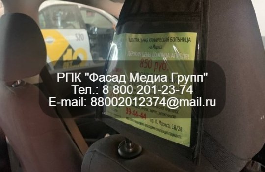 Размещение рекламы на такси отличается особой эффективностью. Высокая отдача от рекламы обусловлена персональным воздействием на каждого пассажира. Не заметить рекламу, размещенную в салоне машины, невозможно. На данный момент мы можем предложить стикеры, подголовники, листовки в салоне такси. Обращайтесь. Будем рады сотрудничеству